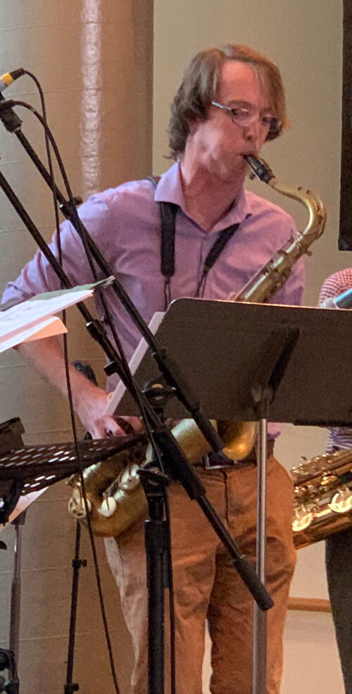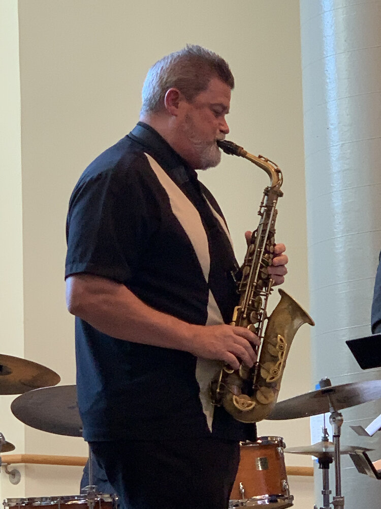 Band-leader Dave Becker put together a world-class group for the event. The rhythm section consisted of Dylan Johnson (bass), Marshall Otwell (piano), and Darrell Voss (drums). The front line was Dave Becker, Andrew Conrad, Sam Franklin, Jake Hammer, Ron McCarley, Michael Mull, Wes Smith and Arthur White. Each front-line man played multiple instruments. In addition to instruments we’d expect to hear at a Saxophone Summit, we were treated to fine jazz work on clarinet, bass clarinet and flute.