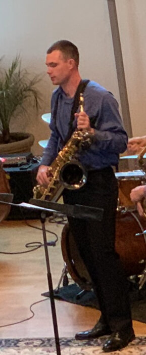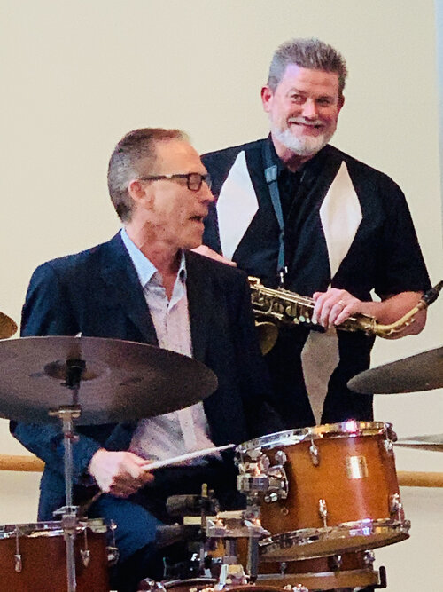 INTERMISSION - “Kahoot” (aka “Lobby Music” by Kahoot) arranged by Ron McCarley. The front line, backed by Voss on drums, returned for the second set’s opening number. This big ensemble arrangement included several hand-offs and lots of fun atonality. At various points in the tune, the “sections” traded fours: Smith and McCarley on soprano, Franklin and Becker on baritone. The crew laughed and joked their way through the song.